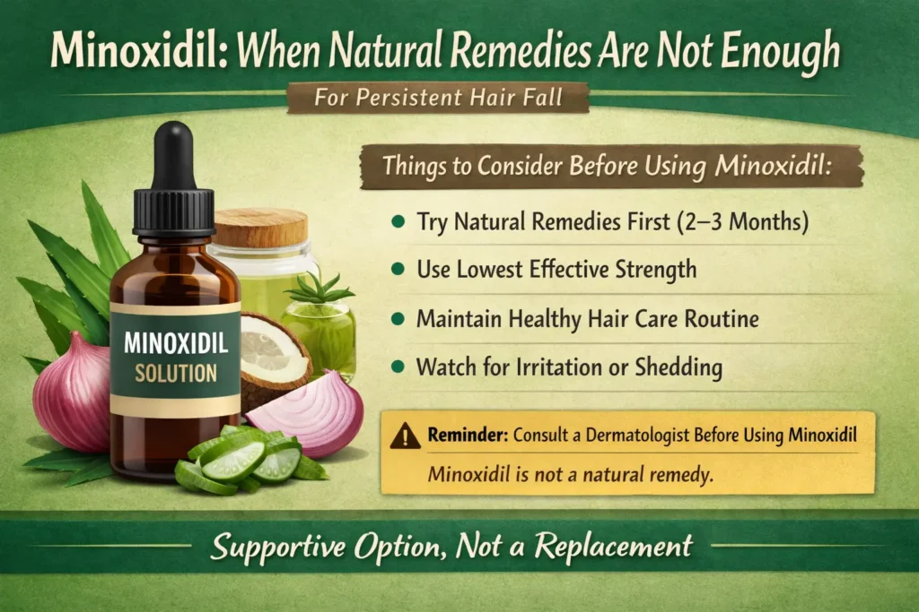 When using natural remedies consistently, visible reduction in hair fall usually takes 4 to 8 weeks. Hair regrowth and improved thickness may take 3 to 6 months, depending on diet, scalp health, and lifestyle habits.