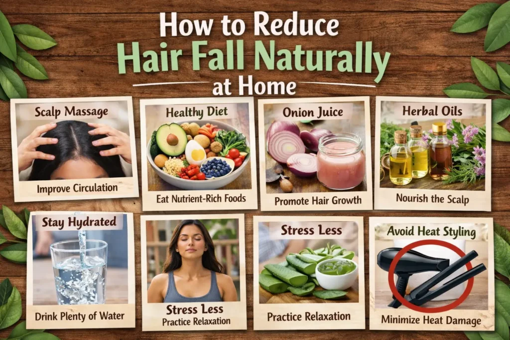 Reduce hair fall naturally at home by using time-tested remedies like nourishing hair oils, fresh aloe vera gel, onion juice, and a blend of powerful natural ingredients.